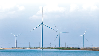 山东东营,风力发电机矗立在滩涂上。